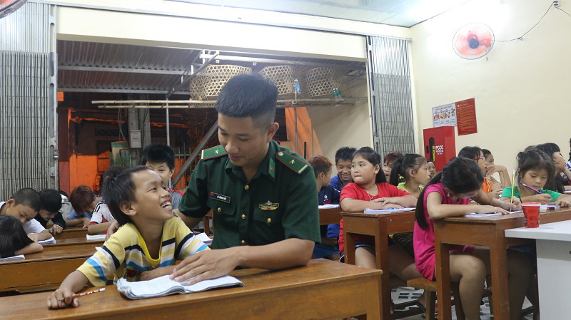 Từ 15 năm trước, để giúp các trẻ em nghèo tránh xa tệ nạn, được học tập, trưởng thành, Bộ đội Biên phòng nơi đây đã mượn Nhà văn hóa làm lớp dạy học, vận động các em đến lớp. Lớp học ban đầu chỉ vài người, nay đã lên con số 33 học sinh. Cứ khoảng 7h tối, từ các ngả đường bê tông men sườn núi Sạn, những đứa trẻ nhà nghèo đã dắt nhau về, quần tụ đông đủ trong lớp học ở nhà văn hóa khu phố. Không phải quần tươm tất, cũng không cặp nặng lỉnh kỉnh, mỗi em chỉ một tập vở trên tay, thoải mái bước vào lớp.
