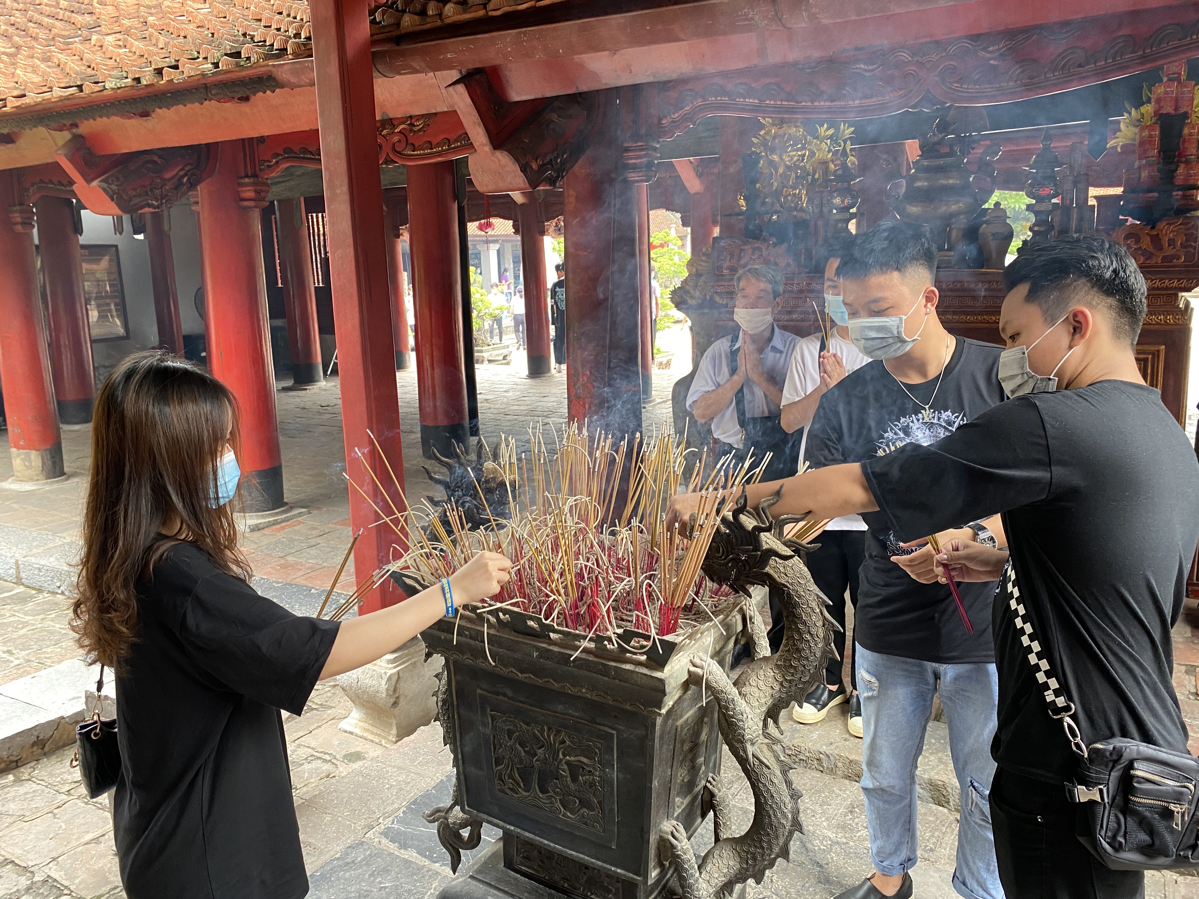 Ông Nguyễn Văn Tú (Phó Giám đốc Văn Miếu - Quốc Tử Giám) chia sẻ: “Không chỉ học sinh, sinh viên vào thắp hương trong những ngày rằm, mùng 1 mà tất cả du khách đều được nhắc nhở việc phòng chống dịch. Chúng tôi làm các biện pháp chống dịch, nhân viên đều phải đeo khẩu trang và trang bị nước sát khuẩn, đo thân nhiệt”