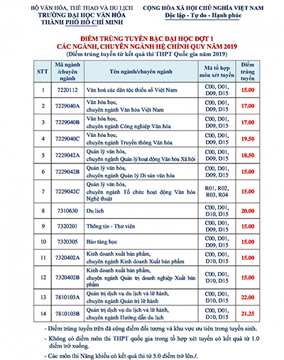 Cùng với công bố điểm chuẩn, Trường ĐH Văn hóa TP.HCM cũng đã công bố danh sách hơn 1.000 thí sinh trúng tuyển ĐH hệ chính quy năm 2019. Theo thông báo, thời gian nhập học là 8 giờ ngày 23.8. Các thí sinh phải xác nhận nhập học chậm nhất trước 17 giờ, ngày 15.8. Quá thời hạn này, thí sinh không xác nhận nhập học được xem là từ chối nhập học và Nhà trường được xét tuyển thí sinh khác. Thí sinh nhập học sau ngày 23.8 phải báo cáo Nhà trường qua email: daotao@hcmuc.edu.vn, nếu không báo cáo thì coi như bỏ học.