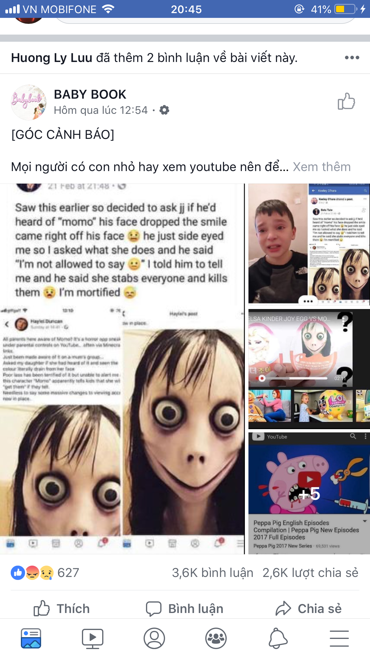 Chia sẻ về tác động của các video không phù hợp dành cho trẻ em, facebook có tên Bui Thu Uyên cho biết: Em trai mình đã 7 tuổi rồi, toàn xem các phim hoạt hình ma kinh dị nên ban ngày đi một bước là theo một bước, không dám ngồi nhà một mình cũng không dám ngủ một mình.