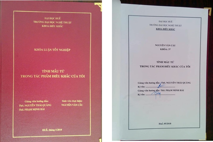 Thế nhưng, trong danh sách hướng dẫn khóa luận tốt nghiệp cho sinh viên điêu khắc khóa 37 (tốt nghiệp năm 2018), lại có tên của 3 người không nằm trong danh sách nói trên. Những người này cũng không “liên quan” gì đến chuyên ngành điêu khắc, gồm: ông Phan Lê Chung, giảng viên khoa Hội họa; bà Trần Thị Hoài Diễm, cán bộ phòng Khoa học Công nghệ- Hợp tác quốc tế và ông Phạm Minh Hải, phòng Hành chính tổ chức. Những cán bộ giảng viên này cùng đứng tên hướng dẫn chung với ông Nguyễn Thái Quảng, tức mỗi đề tài có đến 2 người hướng dẫn.
