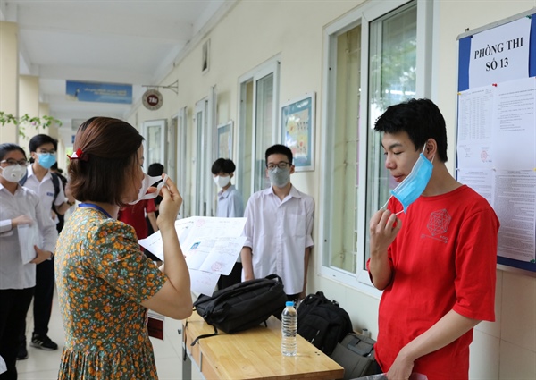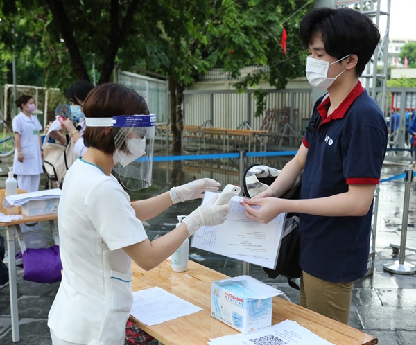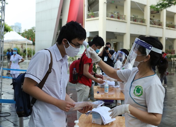 Trước khi vào phòng thi các thí sinh được lực lượng y tế đo thân nhiệt và sát khuẩn tay