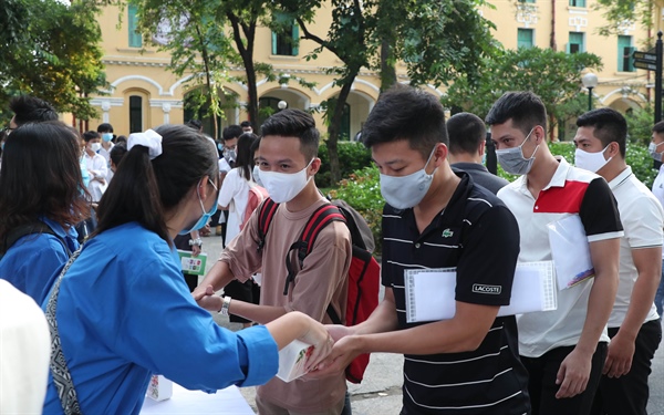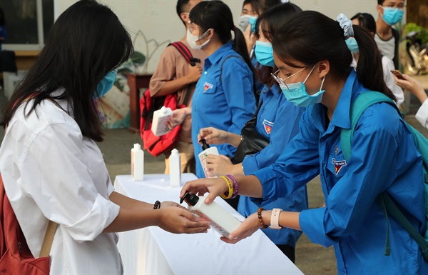 Các đoàn viên, thanh niên tình nguyện hỗ trợ các thí sinh rửa tay sát khuẩn trước khi vào phòng thi