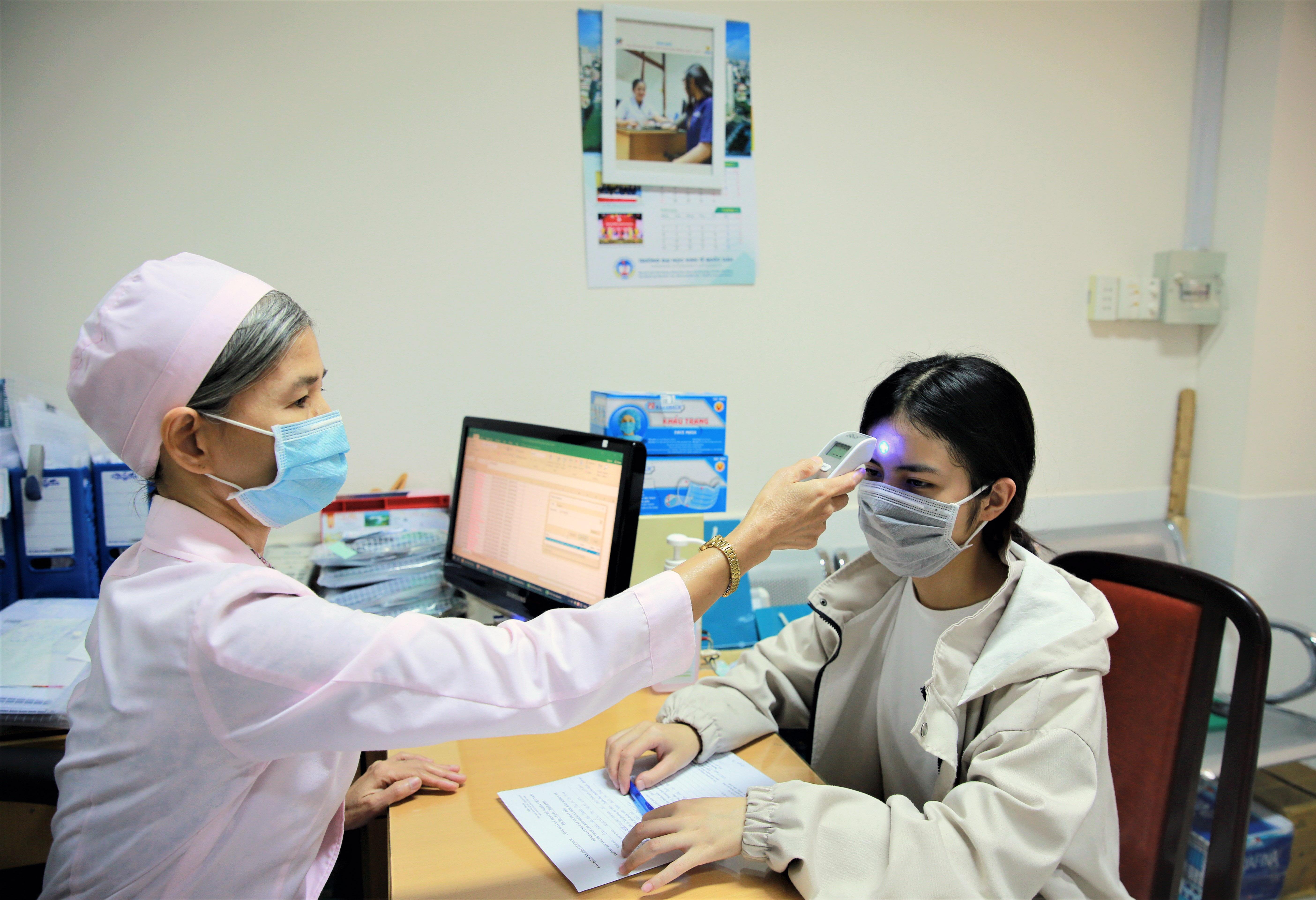 Cán bộ y tế đo thân nhiệt cho sinh viên