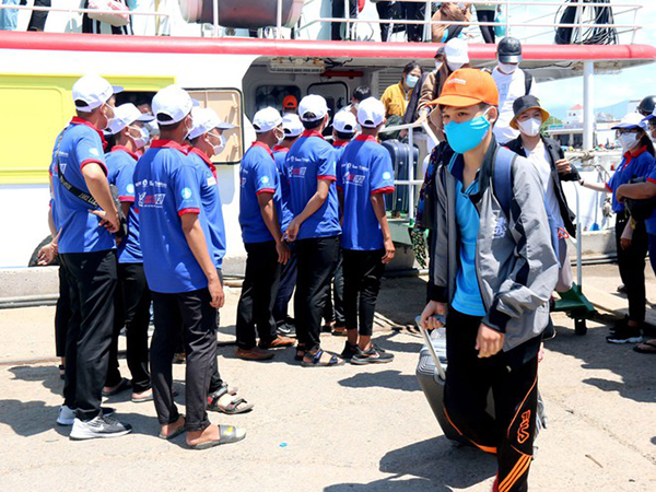 Sinh viên tình nguyện đón thí sinh đảo Phú Quý (tỉnh Bình Thuận) vào đất liền dự thi. Ảnh: H.L