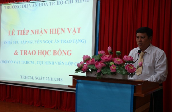 Theo đó, nhà sưu tập Nguyễn Ngọc Ẩn (Phó Chủ tịch Hội Chữ thập đỏ Phường Mũi Né, Thành phố Phan Thiết, tỉnh Bình Thuận) đã hiến tặng cho Trường ĐH Văn hóa TP.HCM tổng cộng hơn 300 hiện vật (bằng chất liệu gốm, đồng…) tính từ năm 2017 đến nay. Đây là đợt hiến tặng lần thứ 13 trong tổng số hơn 6.300 hiện vật đã được nhà sưu tập này hiến tặng cho 19 tỉnh, thành là các bảo tàng và trường đại học.