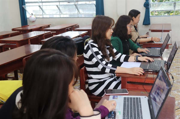Các cô giáo trường Tiểu học Võ Thị Sáu đang tập trung soạn bài trên máy tính