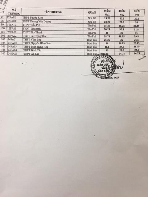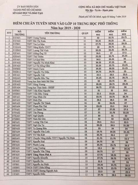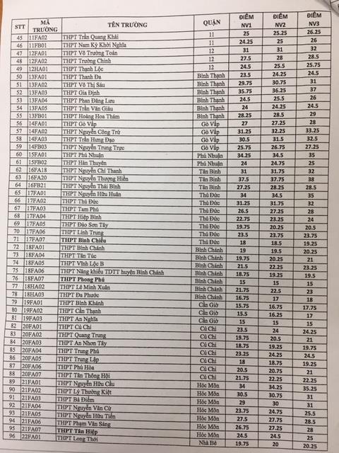 Theo đó điểm chuẩn cao nhất thuộc về Trường Trung học Thực hành- ĐHSP khi có điểm NV1 là 36,75; NV2 là 37,25 và NV3 38 điểm. Điểm thấp nhất thuộc về Trường THPT Nghĩa An, huyệnCần Giờ; THPT Phong Phú, huyện Bình Chánh khi cả ba nguyện vọng đều 15 điểm.
