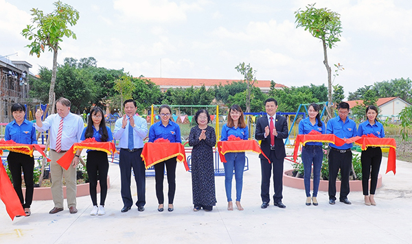 Nguyên Phó Chủ tịch nước Trương Mỹ Hoa cùng các đại biểu trao tặng sân chơi cho các em thiếu nhi tỉnh Long An
