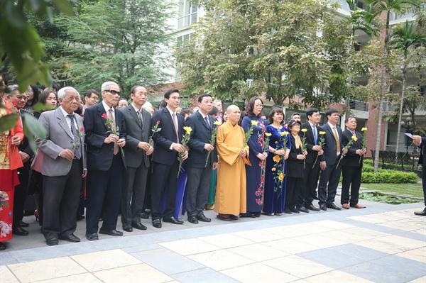 Các đại biểu và các thế hệ lãnh đạo, giảng viên nhà trường dâng hoa tại Tượng đài Bác Hồ