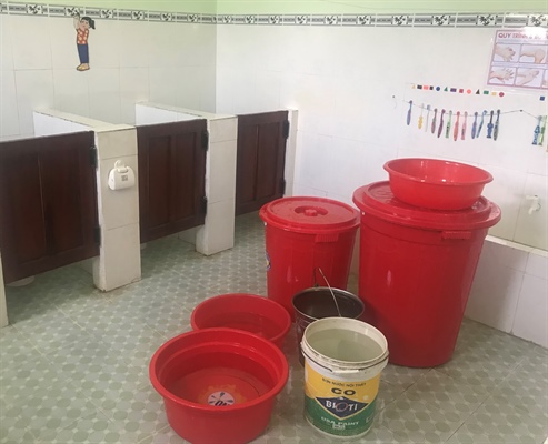 Cô Như cho biết, để cung cấp đủ nước phục vụ cho nhu cầu của hơn 360 trẻ đang theo học tại trường cùng hàng chục giáo viên, nhà trường phải dùng thùng nhựa, xô chậu để tích chứa nước liên tục. Việc lỉnh kỉnh xô chậu dùng để chứa đựng nước trong phòng học của bậc mầm non cũng là một nỗi lo của các giáo viên vì rất nguy hiểm, nhưng nếu không làm vậy thì không thể có nước cho các cháu sử dụng. Các cô giáo phải luôn phiên theo dõi khi các cháu vào phòng vệ sinh, thường xuyên kiểm tra, đóng chốt cửa phòng vệ sinh để đề phòng bất trắc.