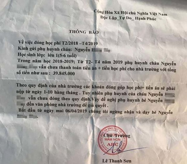 Trước đó, tối ngày 8.4, trên mạng xã hội lan truyền đoạn clip cùng thông tin về sự việc Trường mầm non tư thục ABC ra quyết định “không nhận chăm sóc” đối với cháu N.B.T từ ngày 6.4.2019 vì lý do phụ huynh cháu nợ tiền học phí và tiền ăn từ tháng 2.2018 đến tháng 4.2019 với số tiền 39.850.000 đồng.