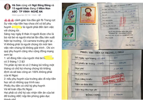Theo báo cáo từ Trường Mầm non tư thục ABC, từ tháng 2.2018 đến 3.2019, gia đình bé N.B.T không đóng các khoản tiền học, tiền ăn cho bé mặc dù cô giáo đã trực tiếp nhắc nhiều lần. Về hình ảnh sổ liên lạc có đóng dấu đã thu tiền của bé N.B.T trên mạng xã hội, theo nhà trường là do “lỗi trong nghiệp vụ chuyên môn của kế toán nhà trường".