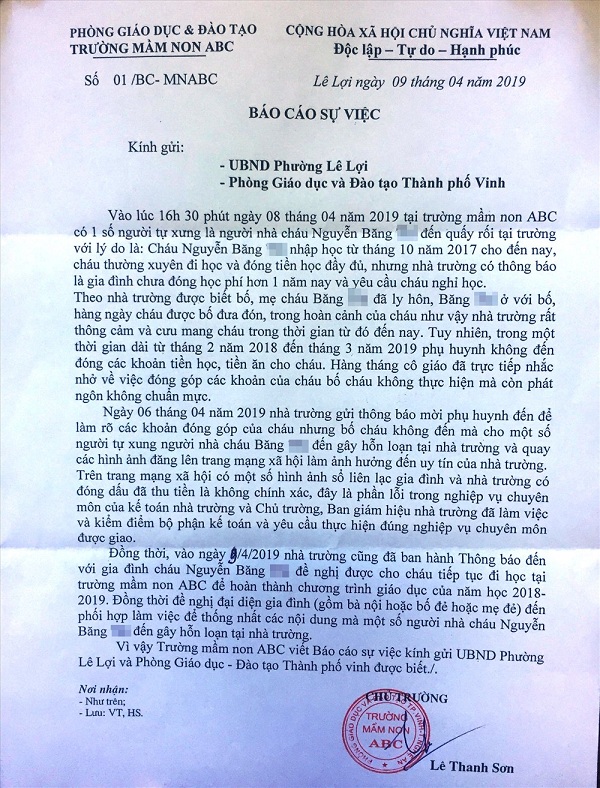 Báo cáo của Trường Mầm non ABC về vụ việc