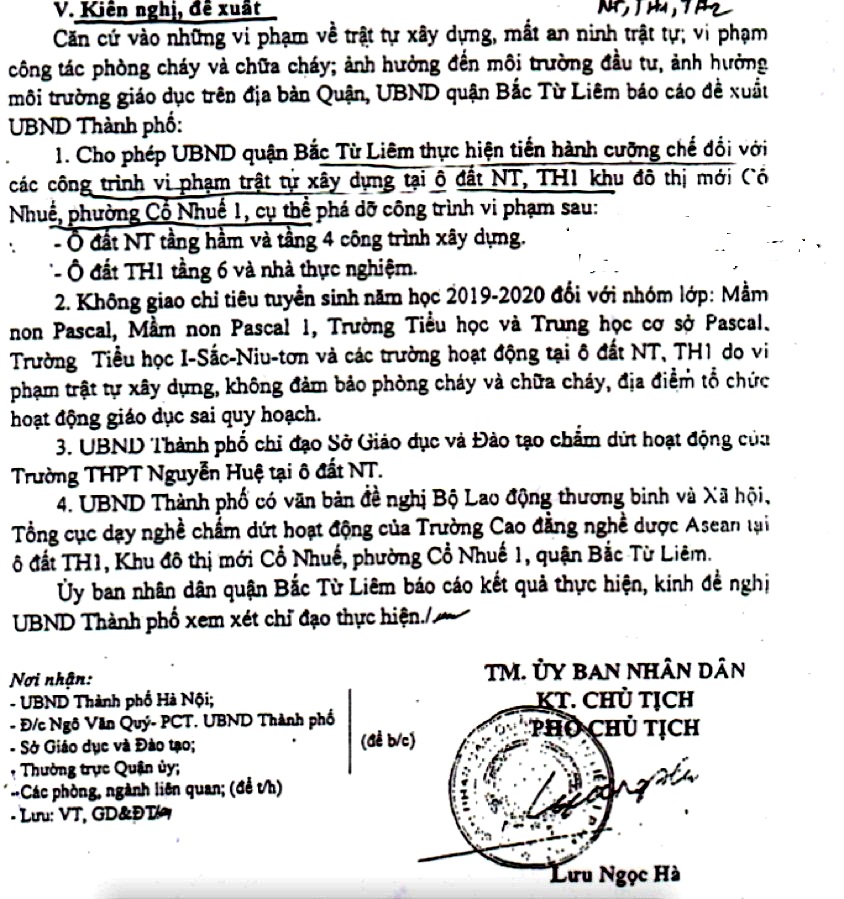 Tại Điều 5 Khoán 2 văn bản số 1226/UBND-GD&ĐT ngày 3.4.2019 của UBND quận bắc Từ Liêm gửi UBND TP Hà Nội báo cáo kết quả thực hiện các nội dung liên quan đến các trường Newton, Pascal có đoạn viết: ”Không giao chỉ tiêu tuyển sinh năm học 2019-2020 đối với nhóm lớp mầm non Pascal, mầm non Pascal 1, trường tiểu học và THCS Pascal, trường tiểu học Isac Newton và các trường hoạt động tại ô đất NT, TH1 do vi phạm trật tự xây dựng, không đảm bảo phòng cháy chữa cháy, địa điểm tổ chức hoạt động giáo dục sai quy hoạch”