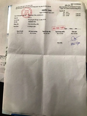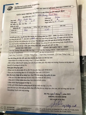 Phiếu thu tiền và hướng dẫn nhập học của trường Newton ngày 3.7