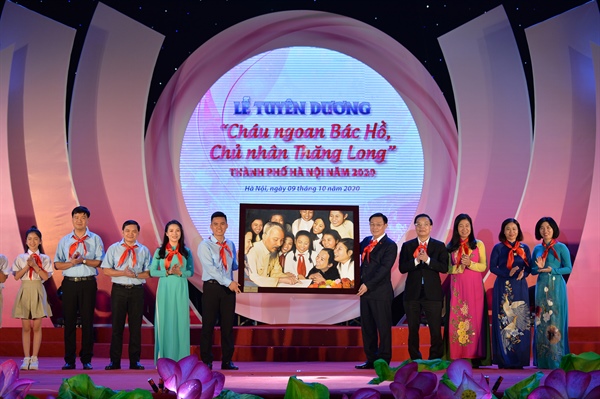 Thay mặt lãnh đạo TP, Bí thư Thành ủy Vương Đình Huệ dành tặng bức tranh “Bác Hồ với Thiếu nhi” cho thiếu nhi Thủ đô thể hiện sự tin tưởng của lãnh đạo Thành phố đối với thế hệ măng non, chủ nhân của Thăng Long, chủ nhân của Đất nước