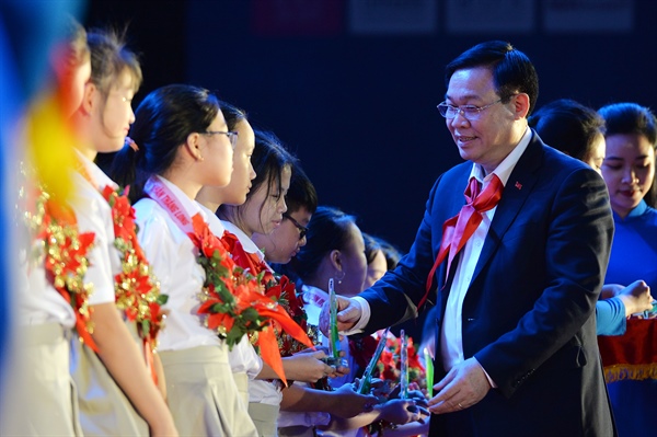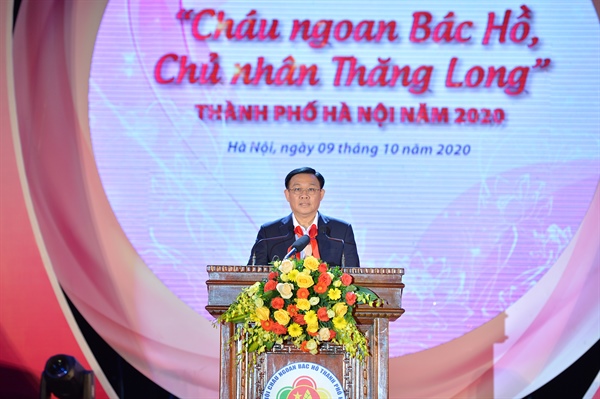 Phát biểu tại buổi lễ, Bí thư Thành ủy Hà Nội Vương Đình Huệ khẳng định, các cháu thiếu nhi dự Đại hội “Cháu ngoan Bác Hồ - Chủ nhân Thăng Long” là những cá nhân tiêu biểu trong các lĩnh vực học tập, văn hóa văn nghệ, thể dục thể thao, tấm gương việc tốt... đại diện cho hơn 1,3 triệu thiếu niên, nhi đồng Thủ đô