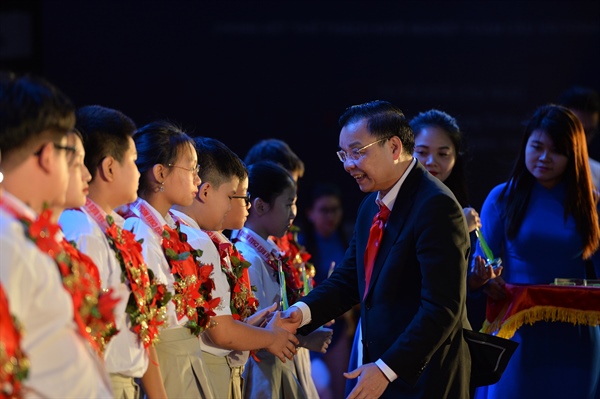 Bí thư Thành Uỷ Hà Nội Vương Đình Huệ trao tặng chứng nhận và chúc mừng các em nhận danh hiệu cháu ngoan Bác Hồ