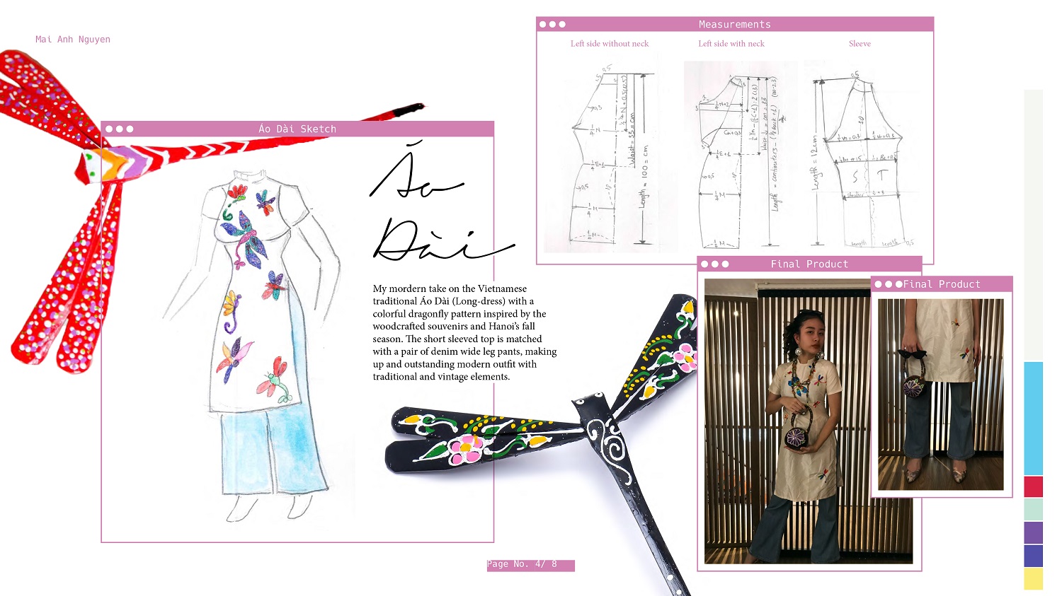 Mai Anh đã gửi bộ Portfolio Nghệ thuật bao gồm những dự án liên quan đến việc thiết kế trang phục từ nguyên liệu tái chế; giới thiệu với hội đồng tuyển sinh mẫu áo dài truyền thống của Việt Nam do bạn tự lên ý tưởng, may đo và thực hiện. Portfolio này cũng thể hiện những hiểu biết của Mai Anh về các xu hướng thời trang, đặc biệt bạn đã trình bày một kế hoạch kinh doanh liên quan đến việc thiết kế lại quần áo cũ đã qua sử dụng và tự làm 1 video clip giới thiệu về kế hoạch này của mình.