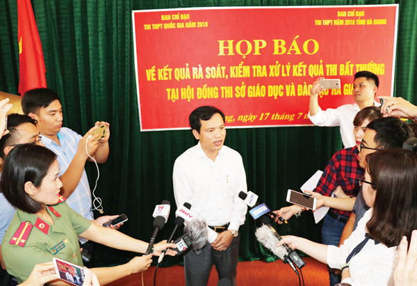 Trước đó, qua dư luận báo chí phản ánh và qua rà soát thấy có dấu hiệu bất thường về kết quả điểm thi của một số thí sinh tại Hội đồng thi Sở GD&ĐT Hà Giang, lãnh đạo Bộ GD&ĐT đã trực tiếp trao đổi với Bộ trưởng Bộ Công an và Bí thư Tỉnh ủy Hà Giang đề nghị phối hợp chỉ đạo điều tra, làm rõ sự việc để xử lý nghiêm các sai phạm.
