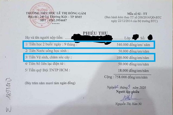 Các khoản thu đầu năm học được cho là sai quy định của trường tiểu học Lê Thị Hồng Gấm