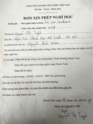 Đáng nói là có những phụ huynh đã chủ động viết Đơn xin phép nghỉ học cho con và thẳng thắn nêu lí do nhằm phản đối dự án, đồng thời khẳng định “khi nào dự án hủy bỏ, con tôi sẽ đi học lại bình thường”. Điều đau xót là đúng ngày Nhà giáo Việt Nam 20.11 các em nhỏ lại bị cha mẹ bắt ở nhà, với lý do là để “bảo vệ môi trường (!?)”. Nguy hại hơn, nhiều học sinh xem việc nghỉ học như một biện pháp để giúp đỡ bố mẹ mà không nghĩ tới những hậu quả nhỡn tiền và lâu dài. Về việc này, những phụ huynh, người nhà của học sinh đã nói gì khi bắt con em nghỉ học ở nhà?