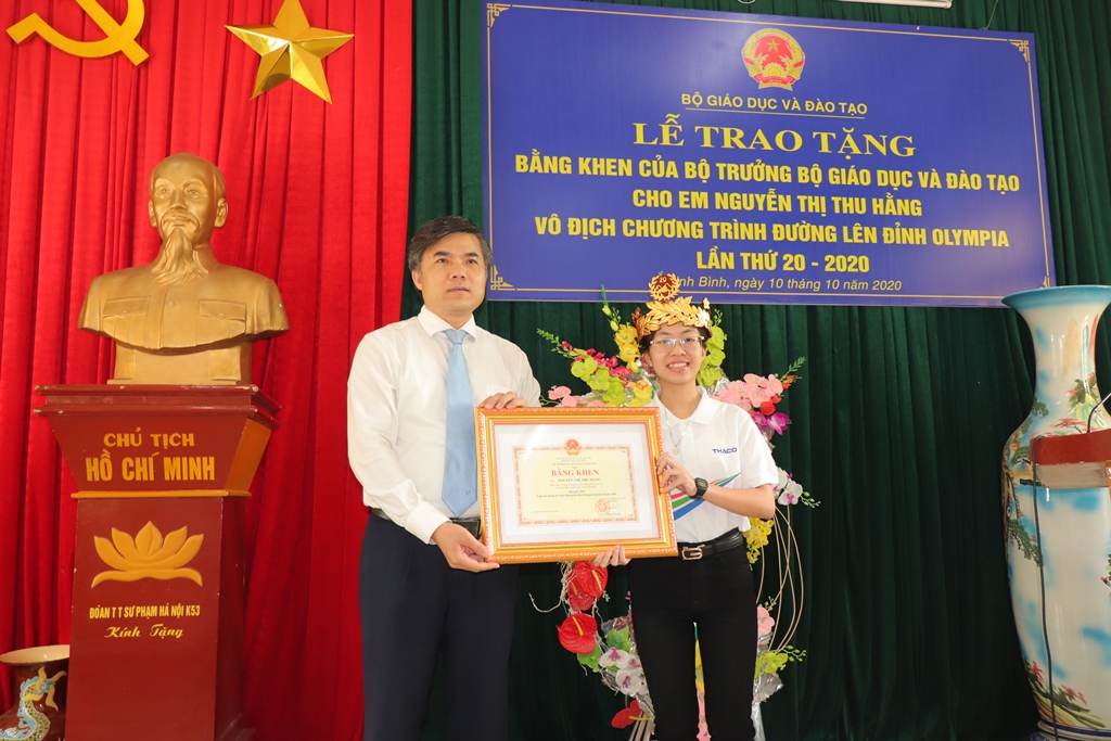 Phát biểu tại buổi lễ, ông Vũ Đắc Toàn, Hiệu trưởng trường THPT Kim Sơn cho biết, em Nguyễn Thị Thu Hằng - học sinh lớp 12B1 của trường là con cả trong gia đình có 2 chị em gái, bố là cán bộ xóm, mẹ làm giáo viên THCS, việc học tập do Hằng tiếp thu trên lớp và tự học ở nhà. Ở trường, Hằng được thầy, cô giáo và bạn bè yêu mến, tin tưởng bởi sự chăm chỉ, học giỏi và thân thiện. Ngay từ khi học THCS tại trường THCS Thượng Kiệm, em đã đạt Huy chương Bạc môn Toán, Huy chương Đồng môn Tiếng Anh cấp Quốc gia...Trúng tuyển vào lớp 10 của trường với vị trí á khoa, Thu Hằng đã phát huy thành tích ngay từ năm học lớp 10 với giải 3 cấp tỉnh về môn nghiên cứu khoa học, giải 3 cấp huyện môn tin học trẻ...Không chỉ học giỏi các môn tự nhiên, trong đó có môn Sinh học, được chọn vào đội tuyển HSG môn Sinh học của trường, qua các lần thi đều đạt giải nhất và đứng đầu đội tuyển, Thu Hằng còn yêu thích ca hát, nhiệt tình tham gia các hoạt động tập thể và đặc biệt Hằng xây dựng một kênh Youtube riêng được nhiều bạn bè và người hâm mộ theo dõi...