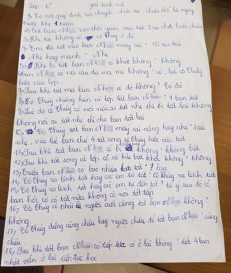 Cụ thể, Ban giám hiệu Trường THCS Duy Ninh đã yêu cầu 23 học sinh lớp 6/2 phải trả lời nhiều câu hỏi có nội dung như sau: Bạn N. bị tát vào thời gian nào? Khi tát bạn N. cô Thủy có mặt ở lớp không? Em tát vào mặt bạn N. bao nhiêu cái? Em tát vào bạn N. mạnh hay nhẹ? Bạn N. có nói tục không? Cô Thủy tát bạn N. mấy cái? Trước đó có bao nhiêu bạn bị tát? Sau khi bị tát bạn N. có ở lại học không?...