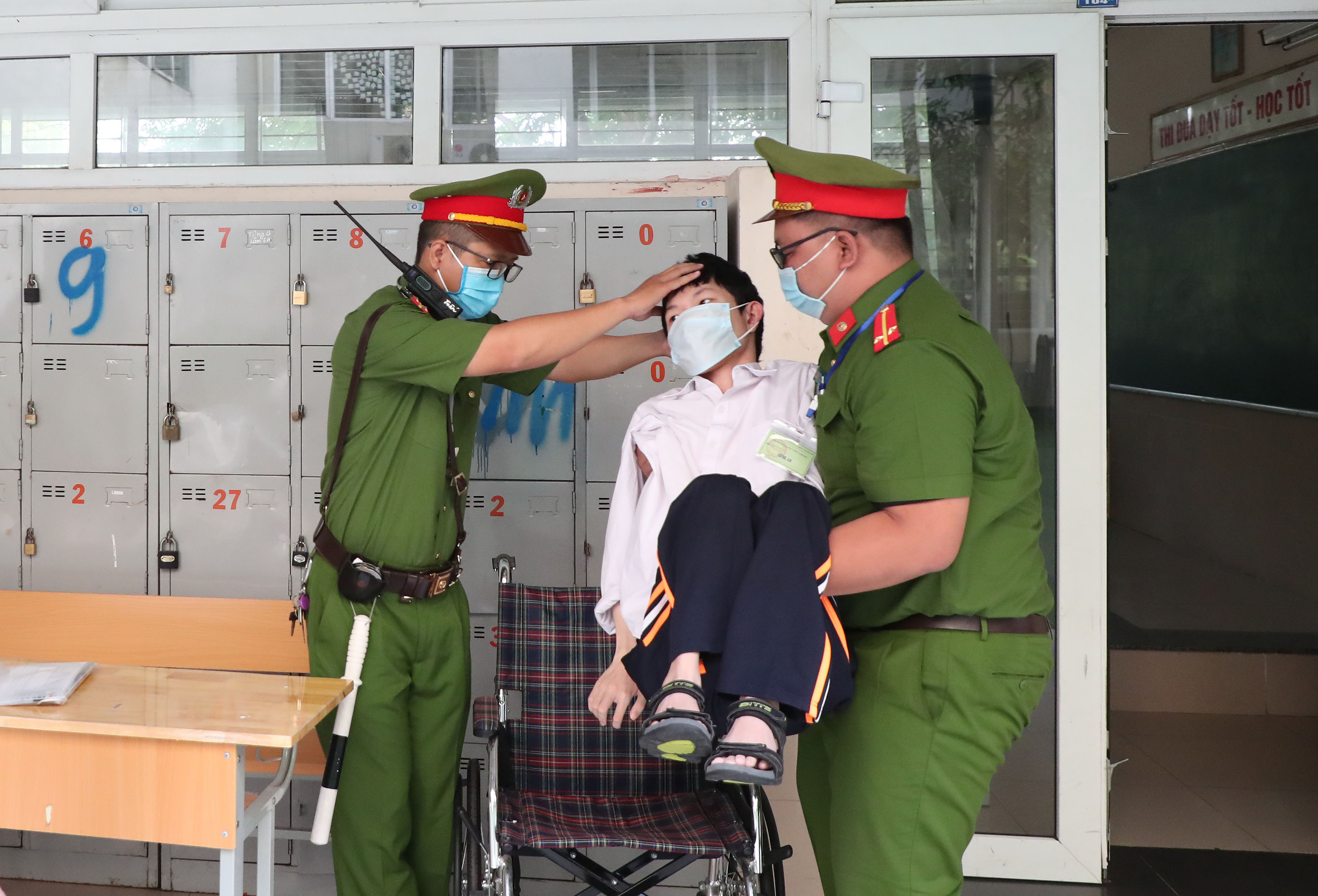 Lực lượng công an hỗ trợ thí sinh khuyết tật tại điểm thi Trường THCS Nghĩa Tân (Hà Nội) Ảnh: TRẦN HUẤN