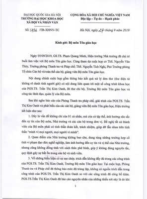 Tại thông báo số 3736 ngày 27.9.2019 của Trường ĐH KHXH&NV, bà Oanh thừa nhận có “thiếu sót” do áp lực từ trường!?