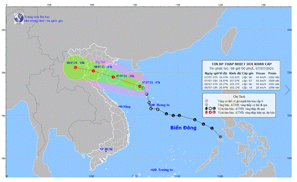 VHO- Theo Trung tâm Dự báo Khí tượng Thuỷ văn Quốc gia, vào hồi 7 giờ ngày 7.7, vị trí tâm áp thấp nhiệt đới ở khoảng 18,4 độ Vĩ Bắc; 110,6 độ Kinh Đông, ngay khu vực Đông Nam đảo Hải Nam (Trung Quốc). Sức gió mạnh nhất vùng gần tâm áp thấp nhiệt đới mạnh cấp 6 (39-49km/giờ), giật cấp 8. Bán kính gió mạnh cấp 6, giật cấp 8 khoảng 70 km tính từ tâm áp thấp nhiệt đới.