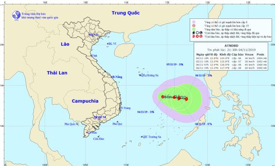 Dự báo trong 24 giờ tới, áp thấp nhiệt đới dịch chuyển chậm theo hướng Đông, mỗi giờ đi được khoảng 5km và có khả năng mạnh thêm. Đến 19 giờ ngày 5.11, vị trí tâm áp thấp nhiệt đới ở khoảng 13,5 độ Vĩ Bắc; 115,9 độ Kinh Đông, cách đảo Song Tử Tây (quần đảo Trường Sa) khoảng 290km về phía Bắc Đông Bắc. Sức gió mạnh nhất vùng gần tâm áp thấp nhiệt đới mạnh cấp 7 (50-60km/giờ), giật cấp 9.