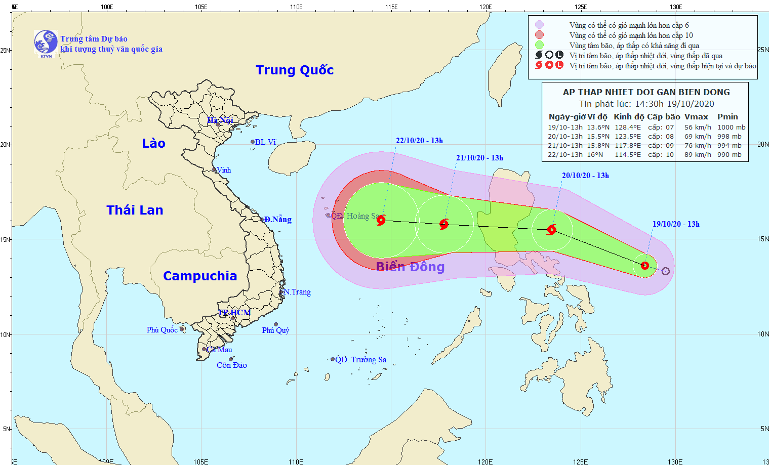 Dự báo trong 24 giờ tới, áp thấp nhiệt đới di chuyển theo hướng Tây Tây Bắc, mỗi giờ đi được 20-25km và có khả năng mạnh lên thành bão. Đến 13 giờ ngày 20.10, vị trí tâm bão ở khoảng 15,5 độ Vĩ Bắc; 123,5 độ Kinh Đông, cách đảo Lu-dông (Phi-líp-pin) khoảng 200km về phía Đông. Sức gió mạnh nhất vùng gần tâm bão mạnh cấp 8 (60-75km/giờ), giật cấp 10.