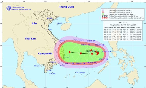 Dự báo trong 24 giờ tới, bão di chuyển chậm về phía Đông, mỗi giờ đi được khoảng 5km và có khả năng mạnh thêm. Đến 19 giờ ngày 6.11, vị trí tâm bão ở khoảng 13,5 độ Vĩ Bắc; 116,8 độ Kinh Đông, cách đảo Song Tử Tây khoảng 350km về phía Đông Bắc. Sức gió mạnh nhất vùng gần tâm bão mạnh cấp 9 (75-90km/giờ), giật cấp 11.