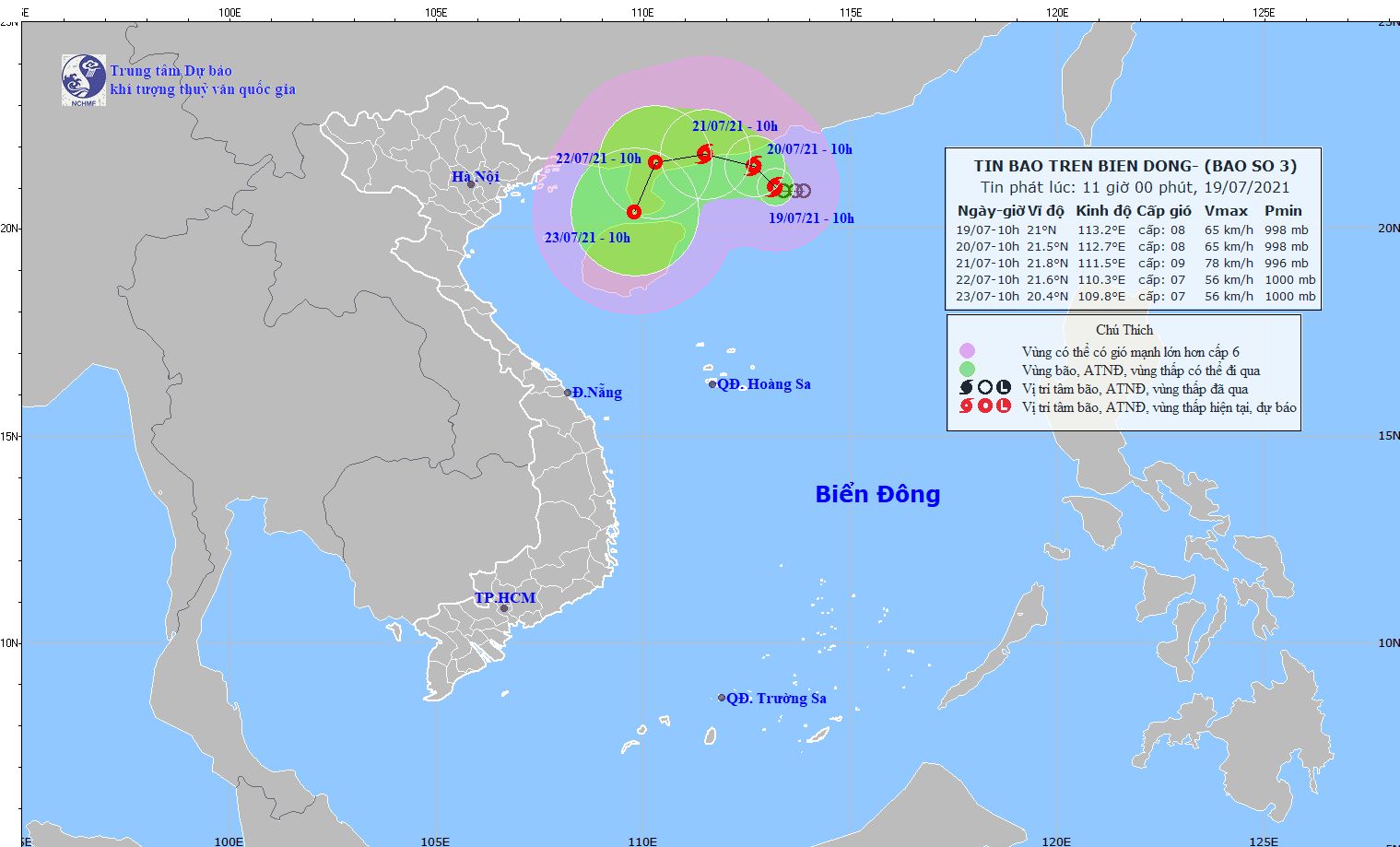 Trong 24 đến 48 giờ tiếp theo, bão di chuyển theo hướng Tây Tây Bắc, mỗi giờ đi được khoảng 5km. Đến 10 giờ ngày 21.7, vị trí tâm bão ở khoảng 21,8 độ Vĩ Bắc; 111,5 độ Kinh Đông, trên vùng ven biển phía Tây Nam tỉnh Quảng Đông (Trung Quốc). Sức gió mạnh nhất vùng gần tâm bão mạnh cấp 8-9 (60-90km/giờ), giật cấp 11.