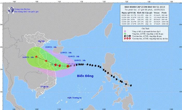 Dự báo trong 24 giờ tới, bão di chuyển chủ yếu theo hướng Tây, mỗi giờ đi được 5-10km và có khả năng mạnh thêm. Đến 16 giờ ngày 11.9, vị trí tâm bão ở khoảng 15,8 độ Vĩ Bắc; 110,1 độ Kinh Đông, cách bờ biển Quảng Trị-Quảng Nam khoảng 200km về phía Đông. Sức gió mạnh nhất vùng gần tâm bão mạnh