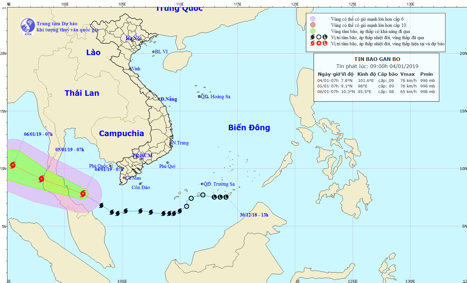 Hồi 07 giờ ngày 04.01, vị trí tâm bão ở khoảng 7,8 độ Vĩ Bắc; 101,6 độ Kinh Đông, cách mũi Cà Mau khoảng 330km về phía Tây Tây Nam, cách đảo Thổ Chu (Kiên Giang) khoảng 270km về phía Tây Nam. Sức gió mạnh nhất vùng gần tâm bão mạnh cấp 9 (75-90km/giờ), giật cấp 12. Bán kính gió mạnh cấp 6, giật cấp 8 khoảng 130km tính từ tâm bão.