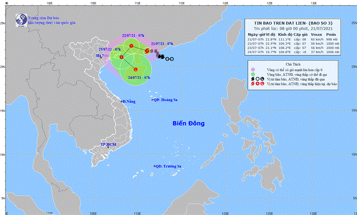 Dự báo trong 24 giờ tới, bão số 3 di chuyển theo hướng Tây Tây Bắc, mỗi giờ đi được 5-10km và suy yếu thành áp thấp nhiệt đới. Đến 7 giờ ngày 22.7, vị trí tâm áp thấp nhiệt đới ở khoảng 22,4 độ Vĩ Bắc; 109,3 độ Kinh Đông, trên đất liền phía Nam tỉnh Quảng Tây (Trung Quốc), cách Móng Cái (Quảng Ninh) khoảng 180km về phía Đông Đông Bắc. Sức gió mạnh nhất vùng gần tâm áp thấp nhiệt đới mạnh cấp 7 (50-60km/giờ), giật cấp 9.