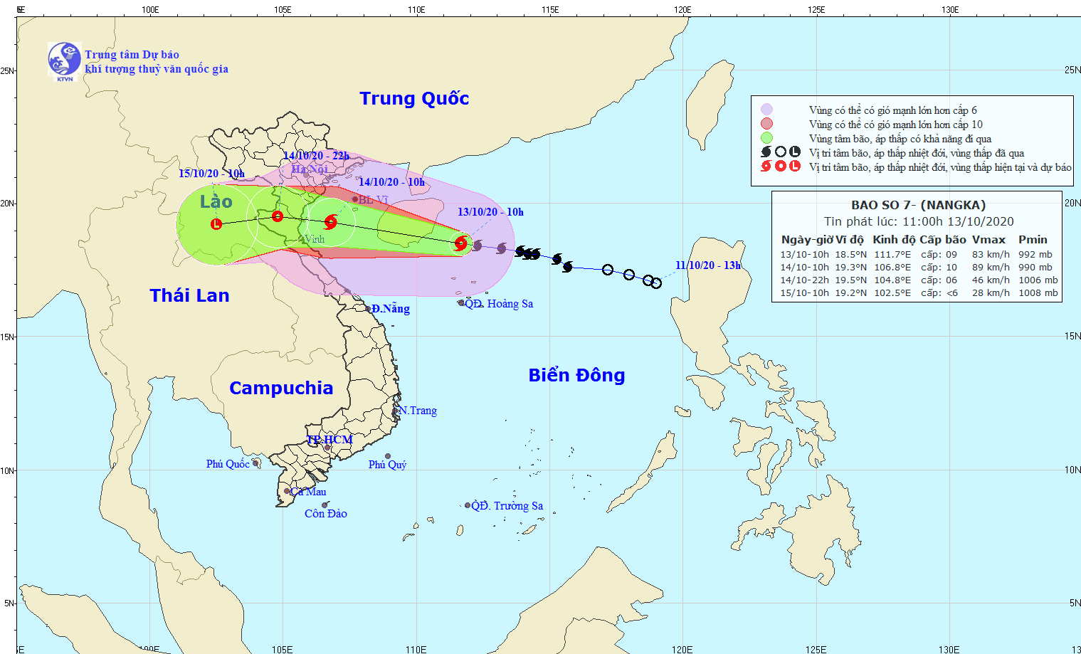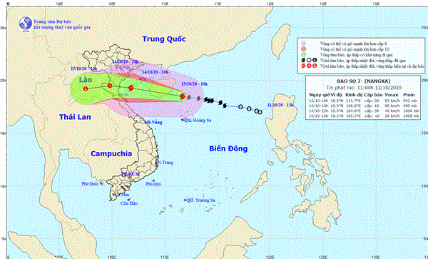 Dự báo trong 24 giờ tới, bão di chuyển theo hướng Tây Tây Bắc, mỗi giờ đi được khoảng 20km. Đến 10 giờ ngày 14.10, vị trí tâm bão ở khoảng 19,3 độ Vĩ Bắc; 106,8 độ Kinh Đông, trên vùng biển Vịnh Bắc Bộ. Sức gió mạnh nhất vùng gần tâm bão mạnh cấp 9-10 (75-100km/giờ), giật cấp 12.