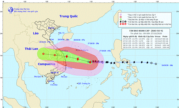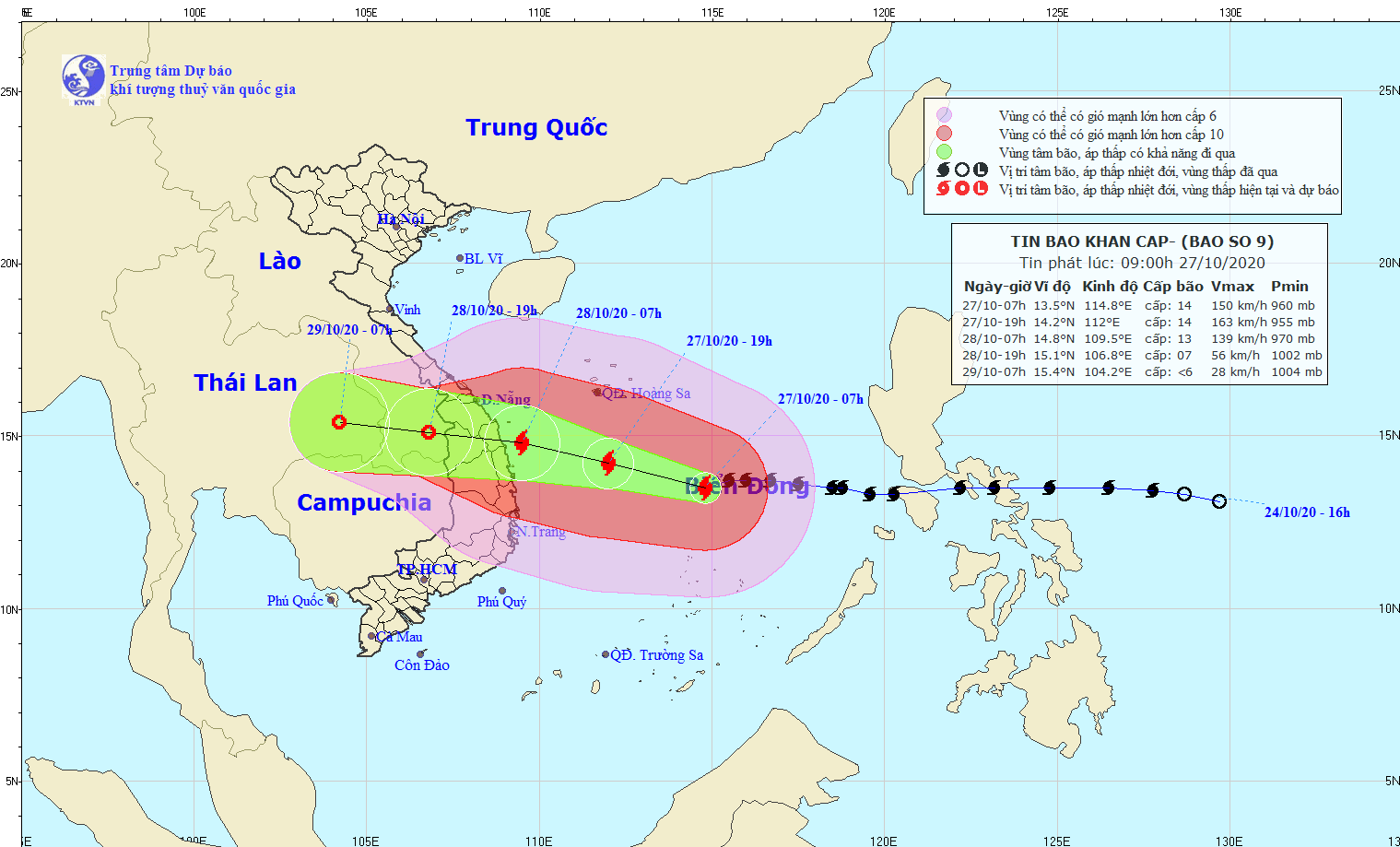 Dự báo trong 24 giờ tới, bão di chuyển theo hướng Tây Tây Bắc, mỗi giờ đi được 20-25km. Đến 7 giờ ngày 28.10, vị trí tâm bão ở 14,8 độ Vĩ Bắc; 109,5 độ Kinh Đông, ngay trên vùng biển từ Đà Nẵng đến Phú Yên. Sức gió mạnh nhất vùng gần tâm bão mạnh cấp 13 (135-150km/giờ), giật cấp 16.
