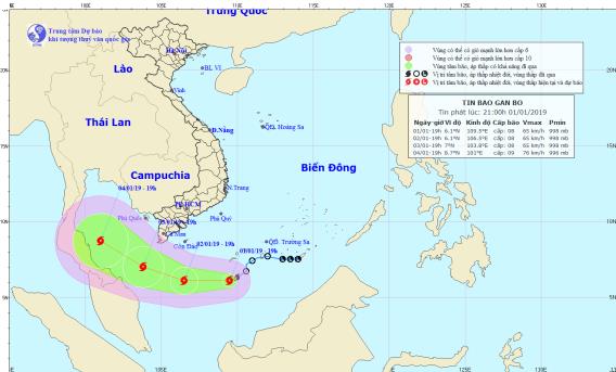 Dự báo trong 24 giờ tới, bão di chuyển theo hướng Tây, mỗi giờ đi được 10-15km. Đến 19 giờ ngày 02.01, vị trí tâm bão ở 6,1 độ Vĩ Bắc; 106,5 độ Kinh Đông, cách mũi Cà Mau khoảng 320km về phía Đông Nam, cách Côn Đảo khoảng 280km về phía Nam. Sức gió mạnh nhất vùng gần tâm bão mạnh cấp 8 (60-75km/giờ), giật cấp 10.