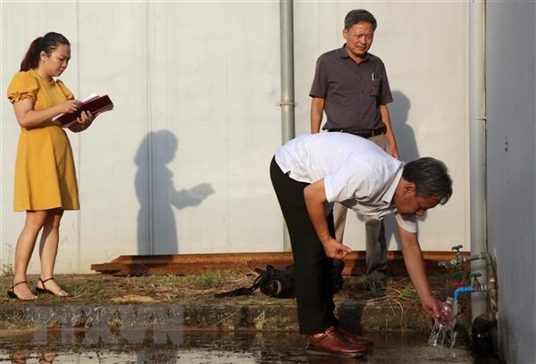 Đoàn kiểm tra liên ngành thành phố Hà Nội lấy mẫu nước tại Công ty Cổ phần Đầu tư nước sạch sông Đà để thực hiện xét nghiệm