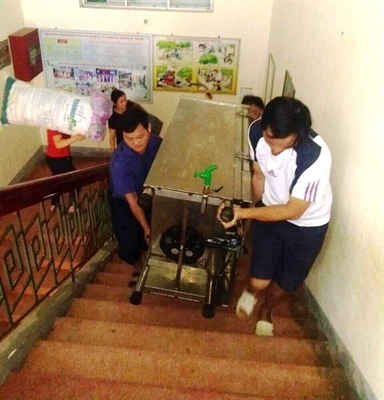 Trước tình hình nước lũ lên nhanh diễn biến phức tạp, trong ngày 4.9, các thầy cô giáo ở các trường phải tức trực và di chuyển đồ đạc, thiết bị để tránh lũ