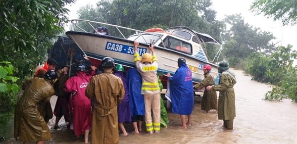 Mưa lũ khiến nhiều nhà cửa của dân chìm trong nước, lực lượng chức năng sơ tán người dân đến nơi anh toàn