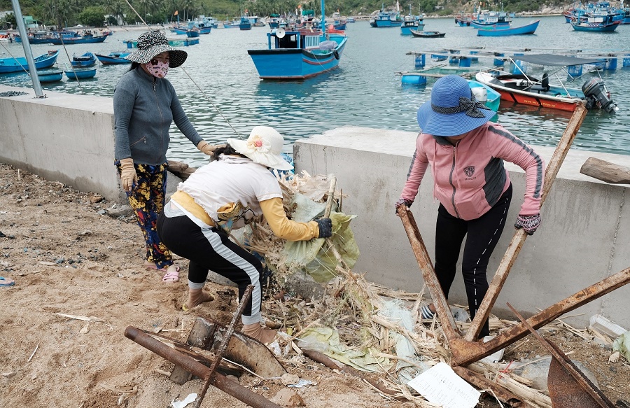 Người dân vịnh Vĩnh Hy gom rác dọc bờ kè chắn sóng sau dịp lễ 30.4 và 1.5
