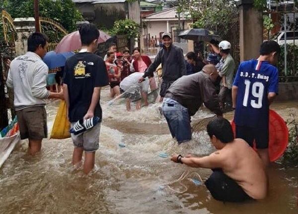 Người dân đổ xô ra đường bắt cá lên theo dòng nước.