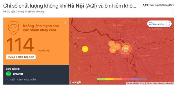 Thế nhưng, đến sáng nay (3.10), cùng một thời điểm đo với những ngày trước, chỉ số chất lượng không khí đã giảm chóng mặt. Cụ thể, chỉ số AQI tính đến 8h sáng nay trên Air Visual là 114 ngưỡng màu cam, chưa bằng 1/2 AQI hôm 1.10 là 245 ngưỡng màu tím.