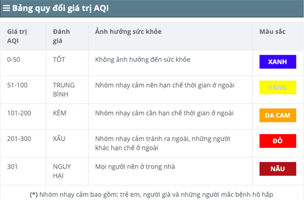 Bảng quy đổi giá trị AQI. Ảnh: moitruongthudo.vn.