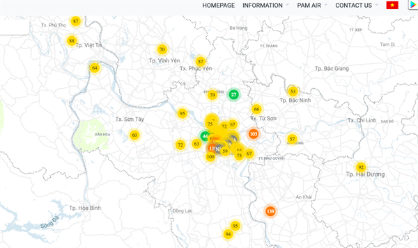 Cập nhật mới nhất trên ứng dụng thời tiết Pam Air, khu vực Hà Nội chủ yếu có mức chỉ số AQI ở ngưỡng màu vàng tức chất lượng trung bình an toàn cho sức khoẻ.